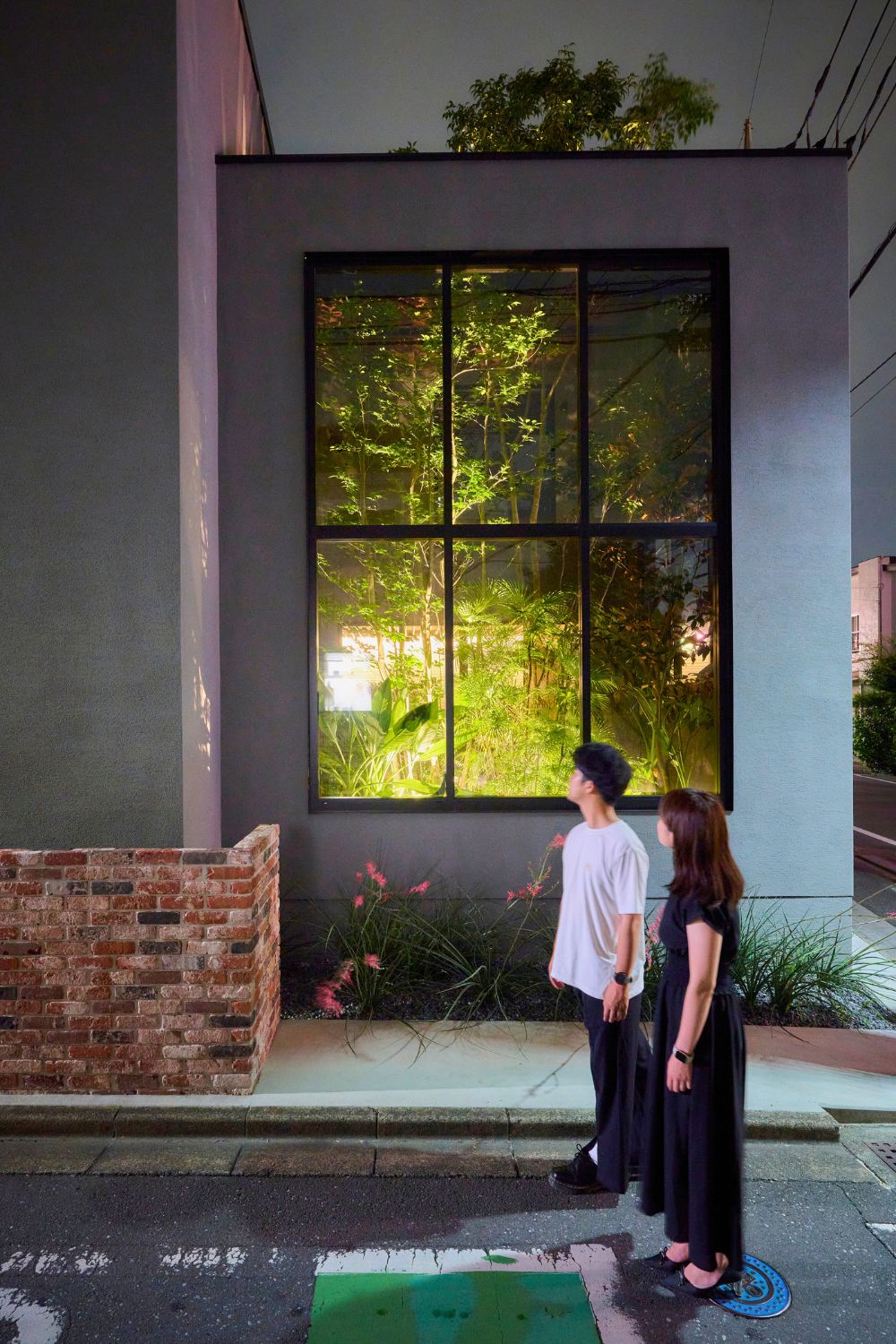 騒音や防犯性等の問題を解決するために、日中はプライバシーを考慮する為に閉じた構えとし、夜間時は綺麗な植栽が地域の景観に寄与する。