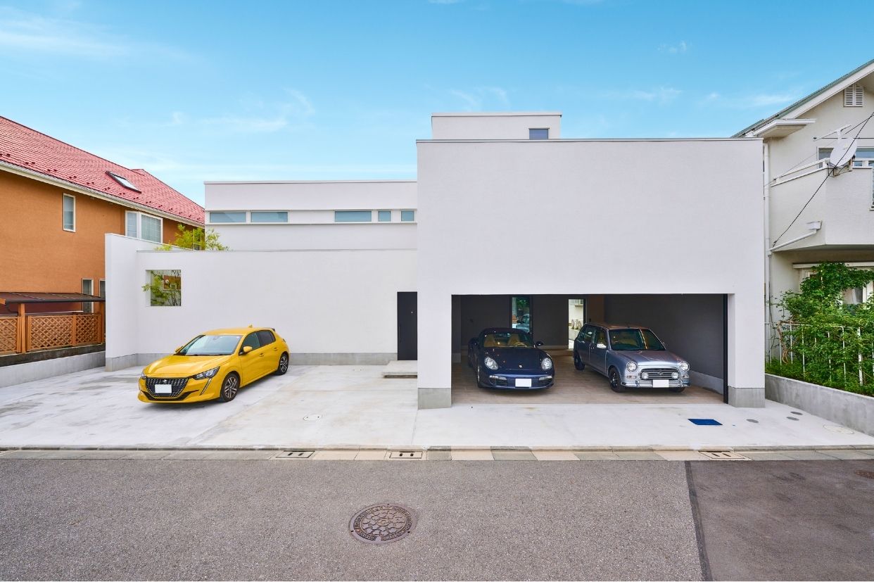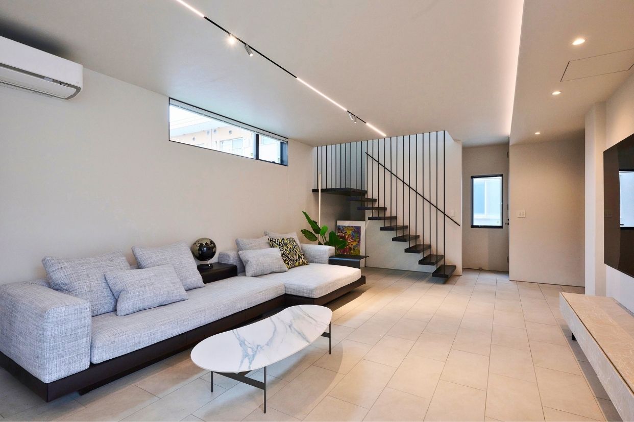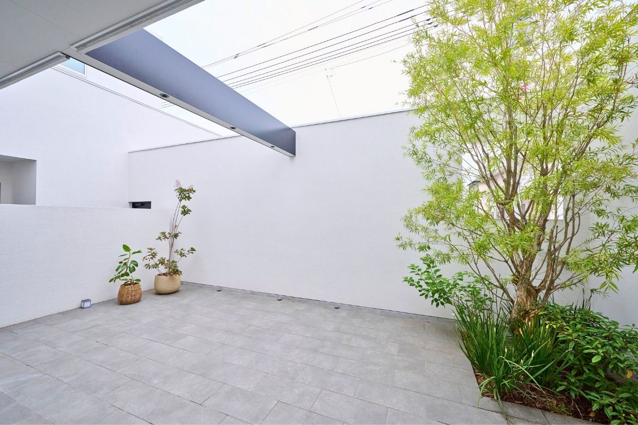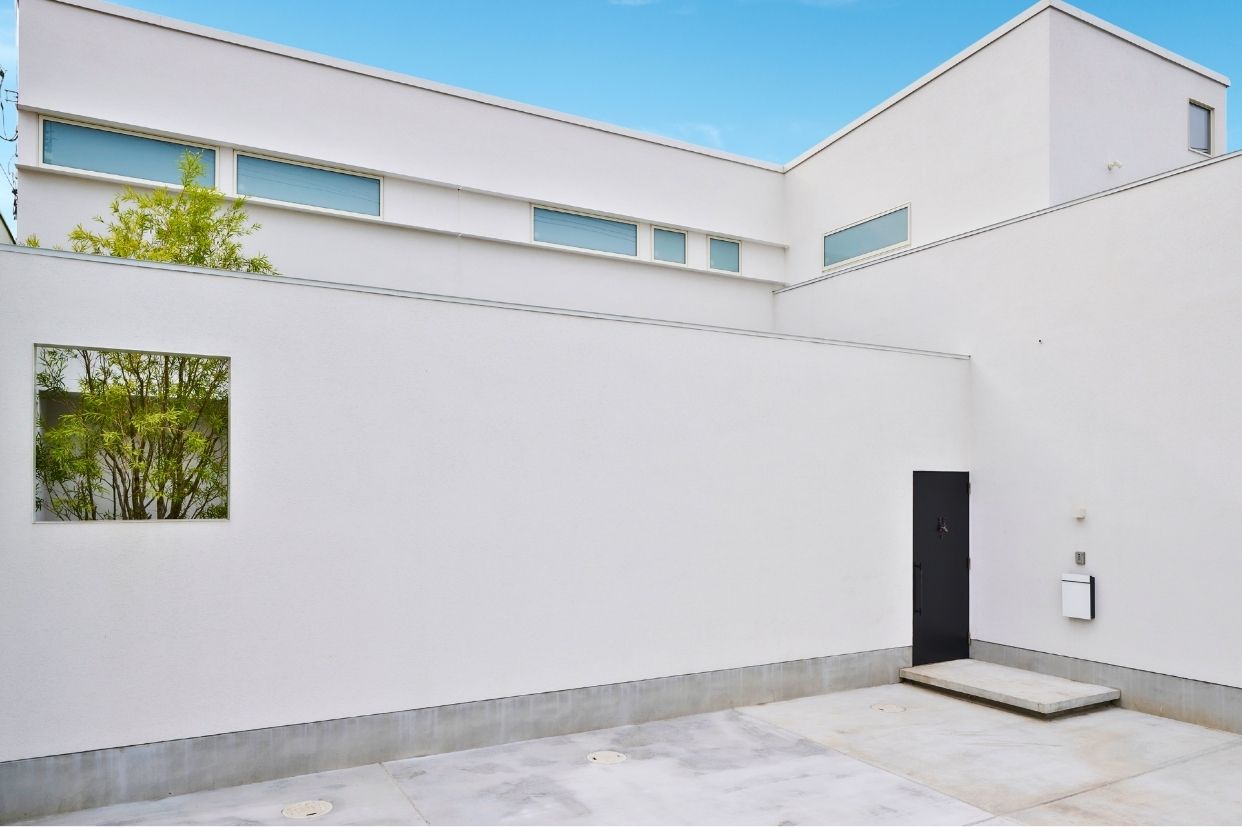Mハウスはライトコートと備え、外部と内部が心地よく共生する住空間を目指しました。騒音や防犯性、プライバシー等の問題を解決する為の装置として、かつ日中は自然光、自然風がこのライトコートを通して、室内に誘うような空間構成としました。住まう人が自然、地域住人とストレスフリーでつながるデザインを構築しました。
