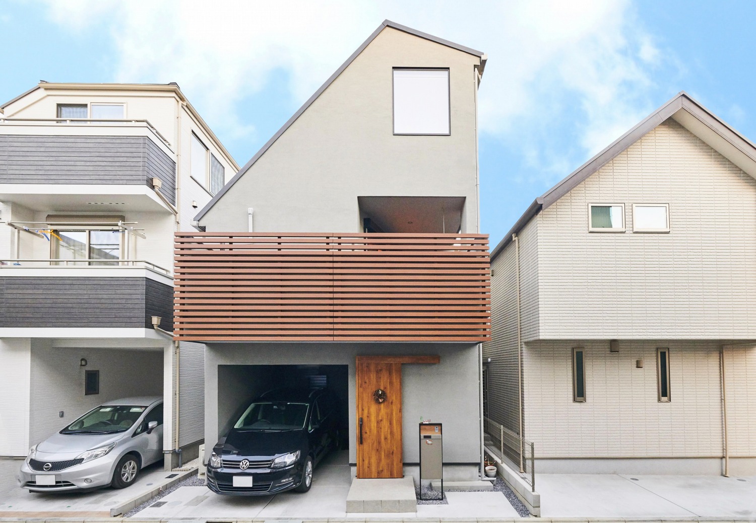 2面が道路に接するため、外部からの視線に配慮しながら、広い空を感じられる住まいをデザインしました。憧れのビルトインガレージやインナーバルコニーが日々の暮らしを彩ります。