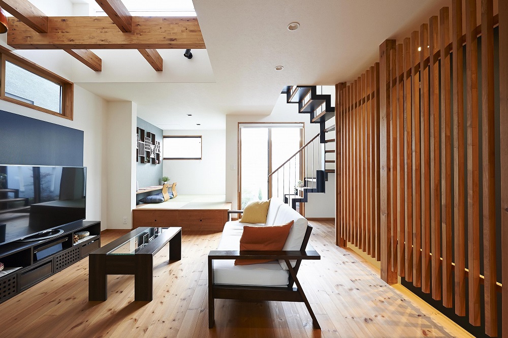 スキップフロアが開放感を与え、吹き抜けによる開口部が光や風を暮らしに運びます。インテリアは木のぬくもりや、格子の間仕切りが生み出す抜け感があり、心地よい時間が過ごせるでしょう。