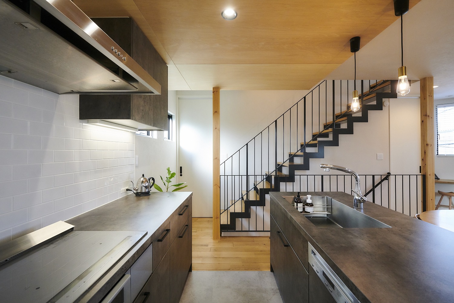LDKは吹き抜けから明かりを取り込み、住宅密集地とは思えない開放感があります。リビングのフロアにはクレイ柄の床材を使用し、ナチュラルな木部とのコントラストが、美しい仕上がりです。ステンレスのキッチンはスタイリッシュで、ダウンフロアのリビング、テラスが空間の広がりを感じさせます。