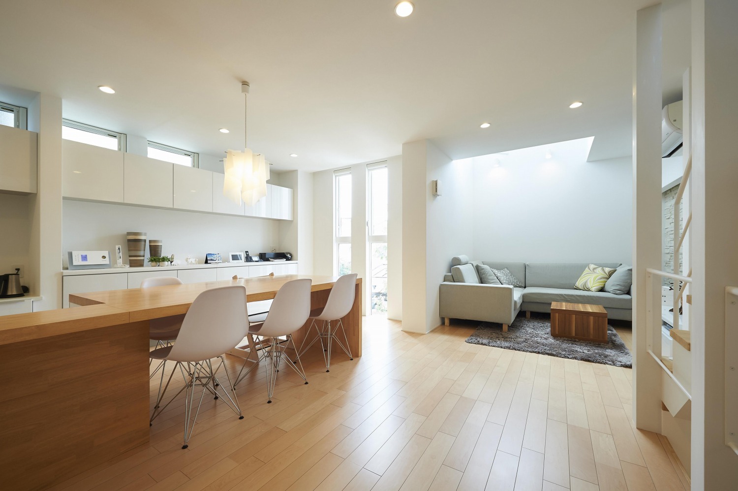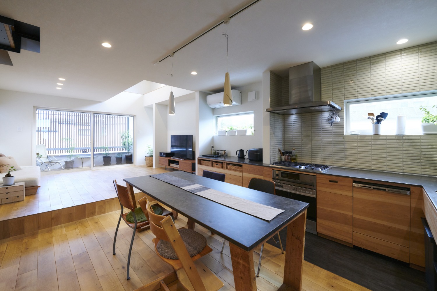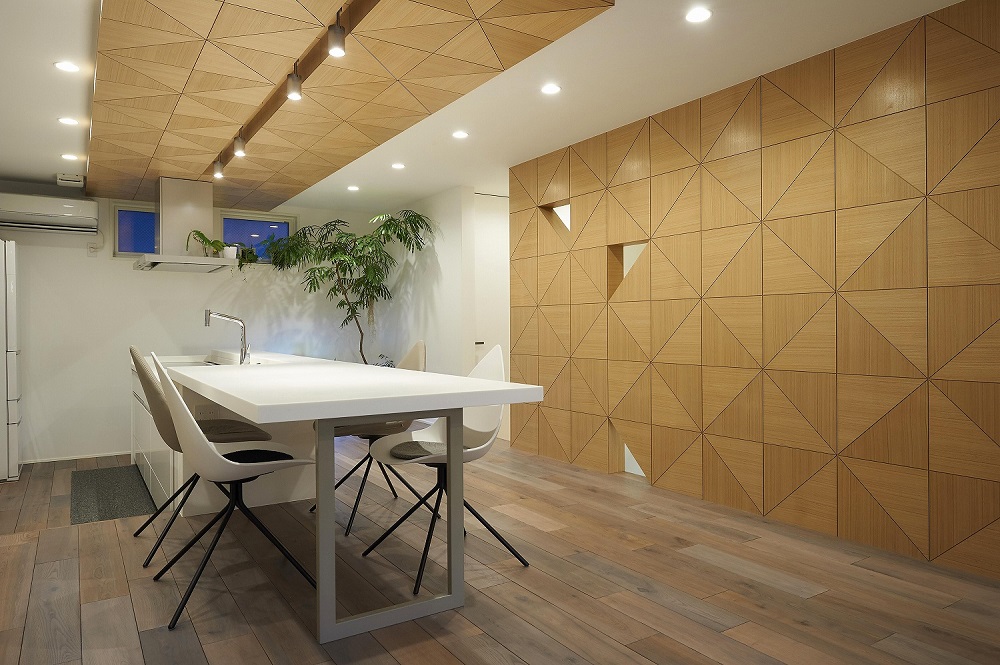 天井とデザインを合わせた木の間仕切り壁がインテリアのアクセントです。キッチンの作業スペースと一体型させたダイニングテーブルの背後には、造作の収納棚が続いています。窓やライトの位置を計算しつくした美術館のようなリビングも印象的です。
