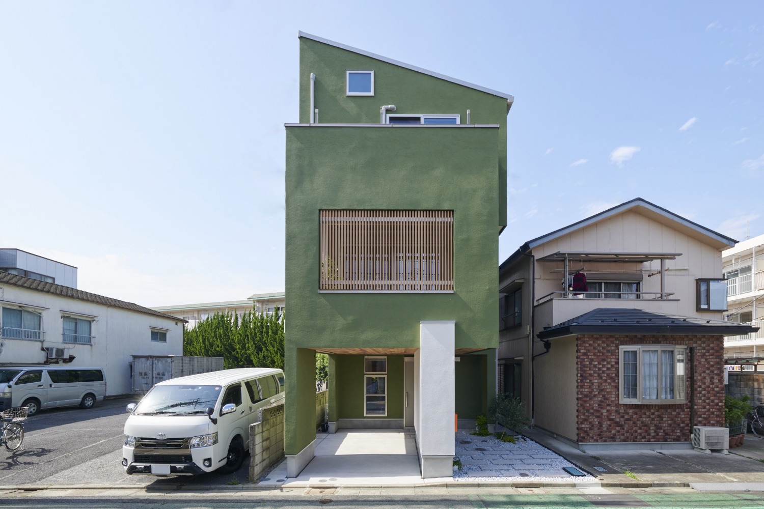 敷地面積は約21坪で、斜線制限(※)という条件に合わせて、最大限にスペースを有効活用するための工夫を凝らしています。斜線制限のような規制があると画一的なデザインになりがちですが、大胆に傾斜を付けた斜め屋根が個性的で、周辺地域でもひときわ目立っています。