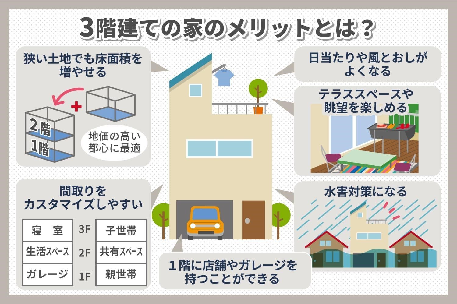 実は3階建てのメリットは、土地代を抑えられるだけではありません。眺めがよかったり、日当たりを確保できたりするなど、さまざまな魅力があります。また1階に店舗を入れたり、ガレージハウスにしたりなど、間取りのバリエーションも広がります。カスタマイズ性にも優れ、オンリーワンな住宅にできる点も利点です。