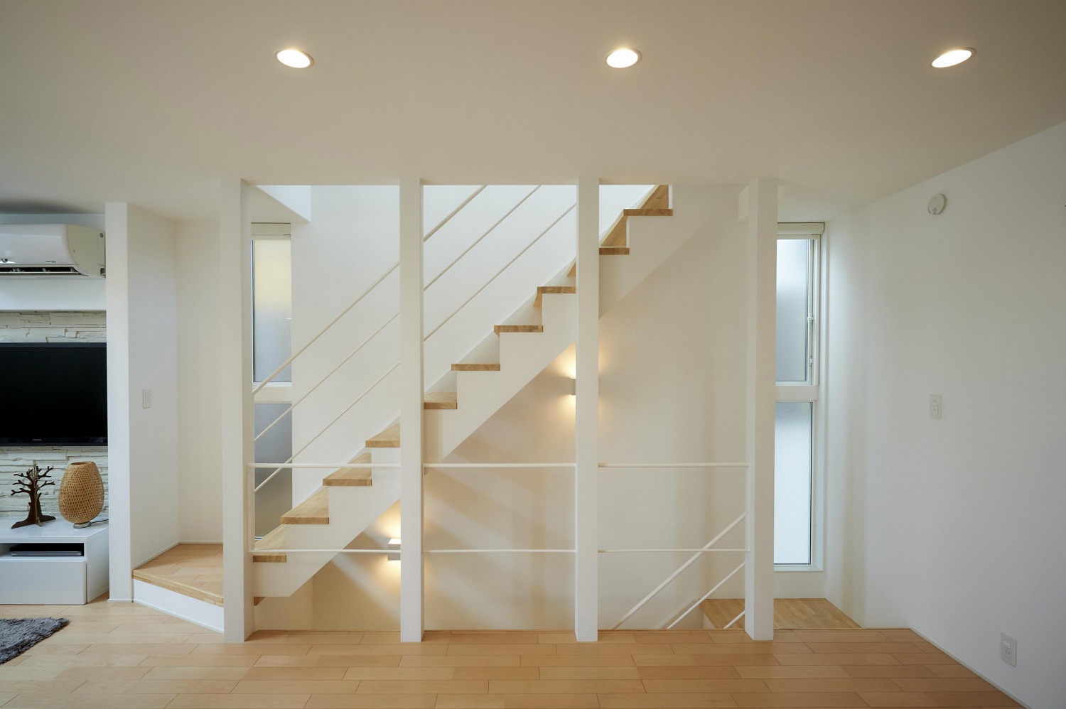 階段も間接照明や窓の位置、手すりなどのデザインを工夫したので、圧迫感がありません。