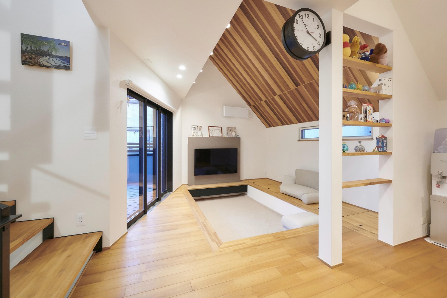 斜めになった勾配天井の下は床を約40㎝下げたダウンフロアとなっているため、圧迫感がありません。屋根が低くなっている場所にはソファを置いて、家族がくつろぐためのスペースとしています。また、ダウンフロアの段差はベンチ代わりにでき、好きな場所に座ることが可能です。