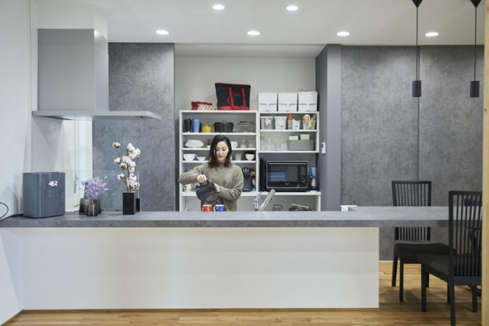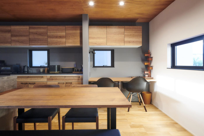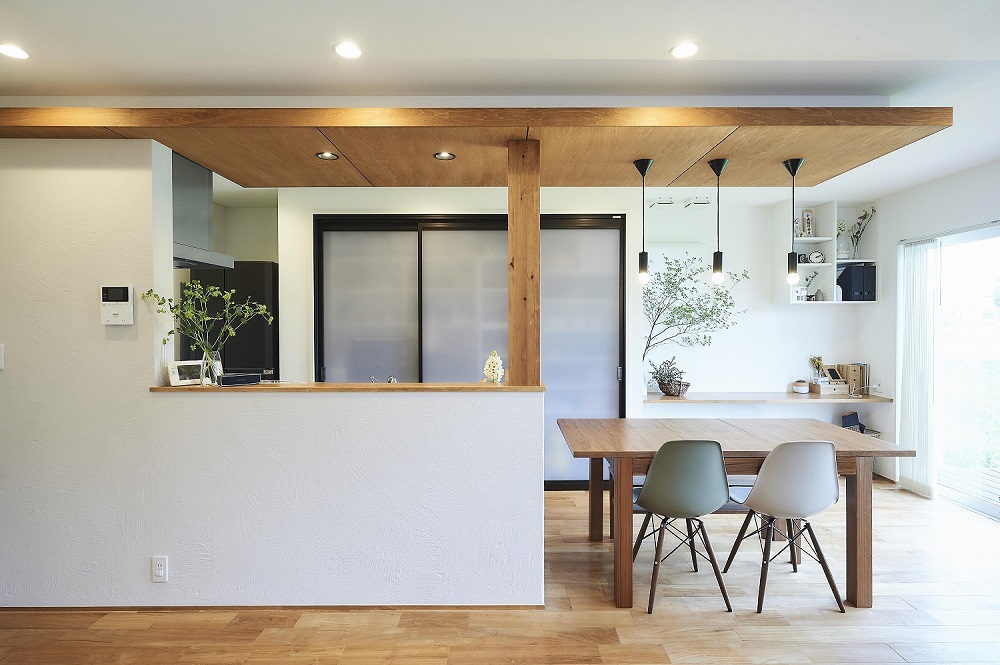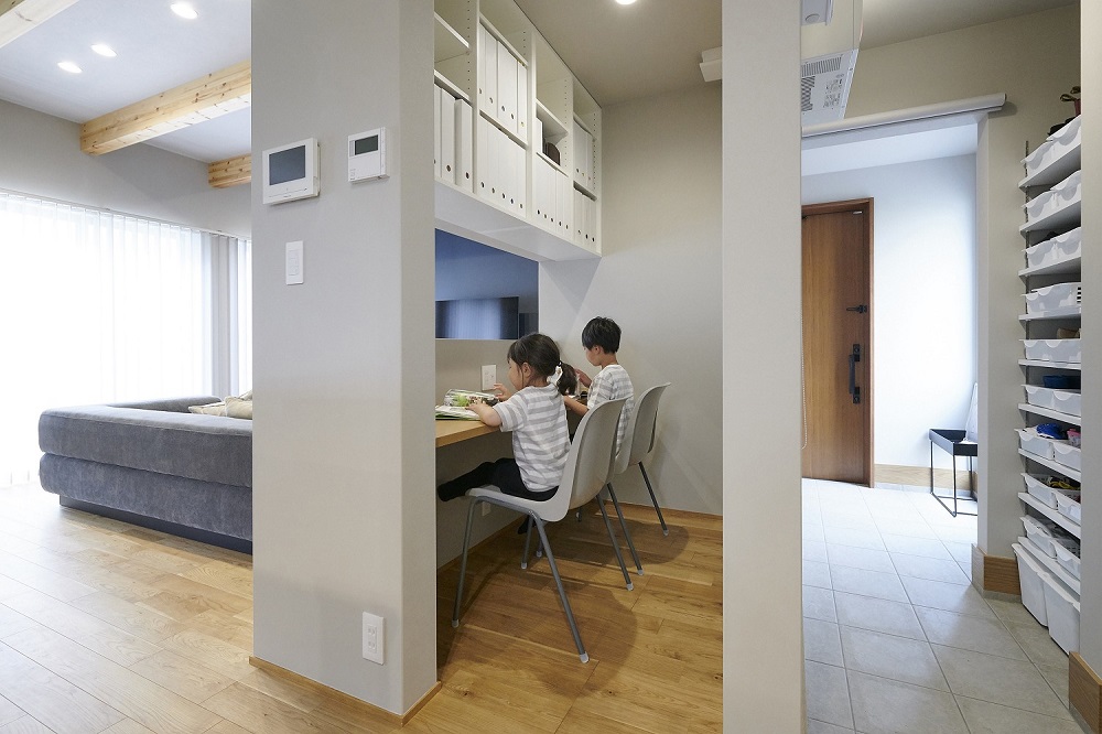 玄関からキッチンまでつながっており、その途中にカウンタースペースが設けられているのがこちらの事例の特徴です。自習室のような空間になっており、開かれた学習スペースよりも、子どもが集中しやすい空間になっています。