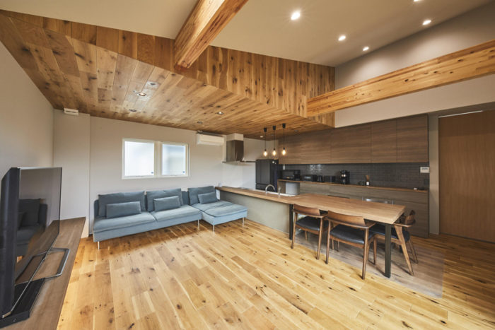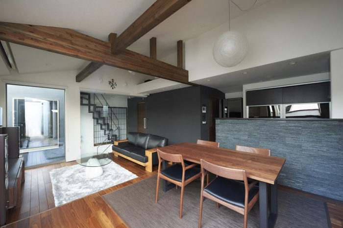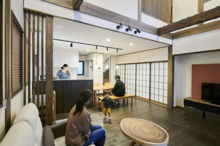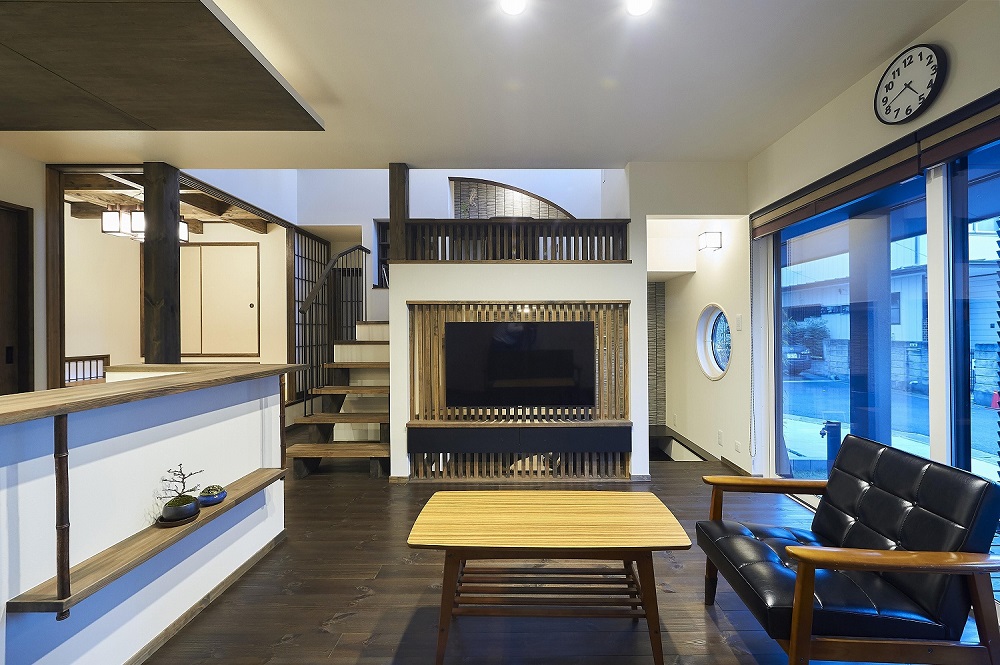 千葉県流山市の、敷地面積147.59m²、延床面積100.19m²の事例です。瓦屋根に木格子など、伝統的な日本家屋をイメージしたデザインで、エボニー色を基調としたリビングになっています。