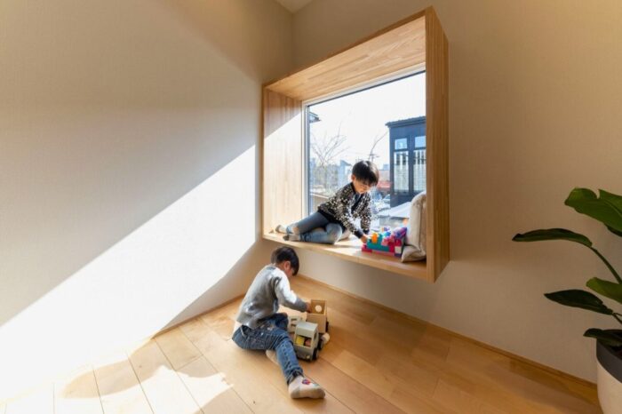 リビングの窓際には2人掛けのワークスペースが配置されており、子どもたちのリビング学習スペースとしてはもちろん、ちょっとした作業空間にも使えます。将来的に学習スペースとして使われなくなっても困らないデザインです。