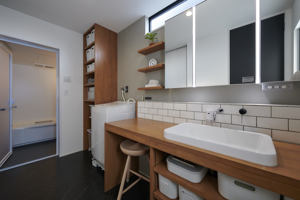 大きな引き出しが付いた洗面台は、足元に棚や扉を付けず開放感を出したオリジナル設計です。狭くなりがちな洗面台をスタイリッシュに演出しています。