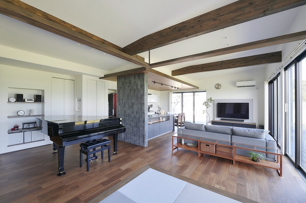 こちらの施工事例は、リビングとキッチン、グランドピアノを置くホールが一体化したオリジナルの空間です。南側には大きな窓で開放的なリビング、北側にはキッチンとホールがあり、壁側に収納を設けています。キッチンはパントリー、ホールはリビング収納となっており、オーディオ機器や書籍など、趣味を楽しむための収納スペースも確保しています。