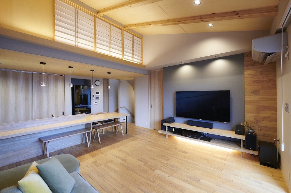 まずは、建具を置かないことで広い空間を実現したリビングの事例をご紹介します。テレビとボードは壁付けになっており、壁の裏側が収納スペースになっています。テレビのコードも収納スペース側に隠しているためすっきりとした見た目になる上、掃除する際も邪魔になりません。