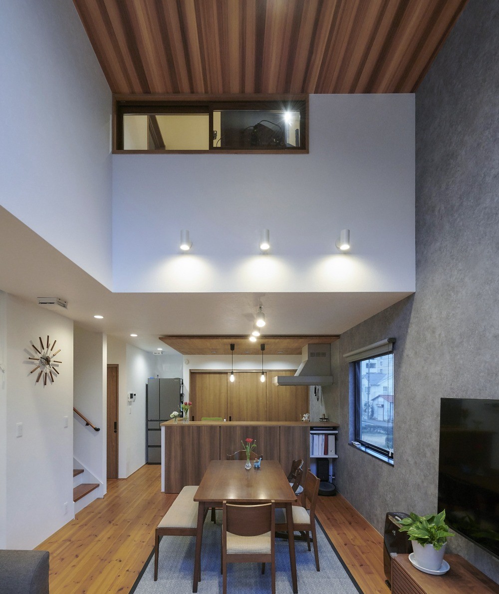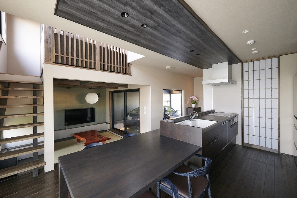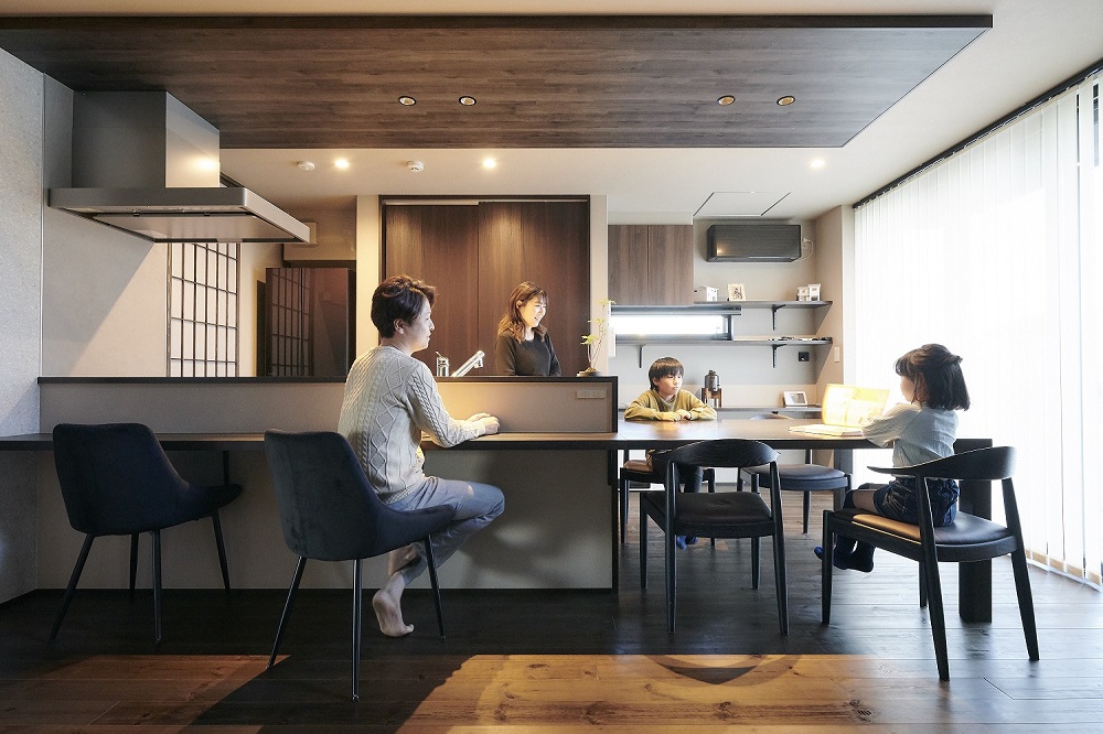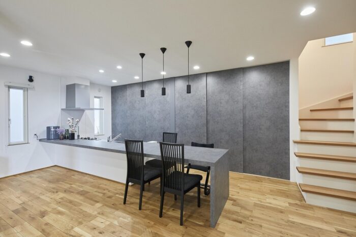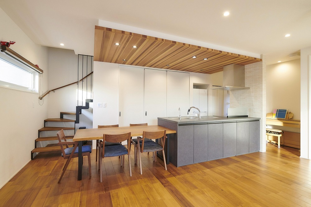 続いて、空間の真ん中にキッチンとダイニングを横並びに置いたデザインです。キッチンは細長い空間ですが、重圧感がなく家族が向かい合って団らんできる場所になっています。