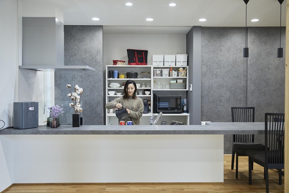壁面収納をブラックの色合いにすると威圧感を与えてしまいますが、ここではグレーのカウンターテーブルと色を合わせて、居心地良く調和の取れたキッチンに仕上げました。