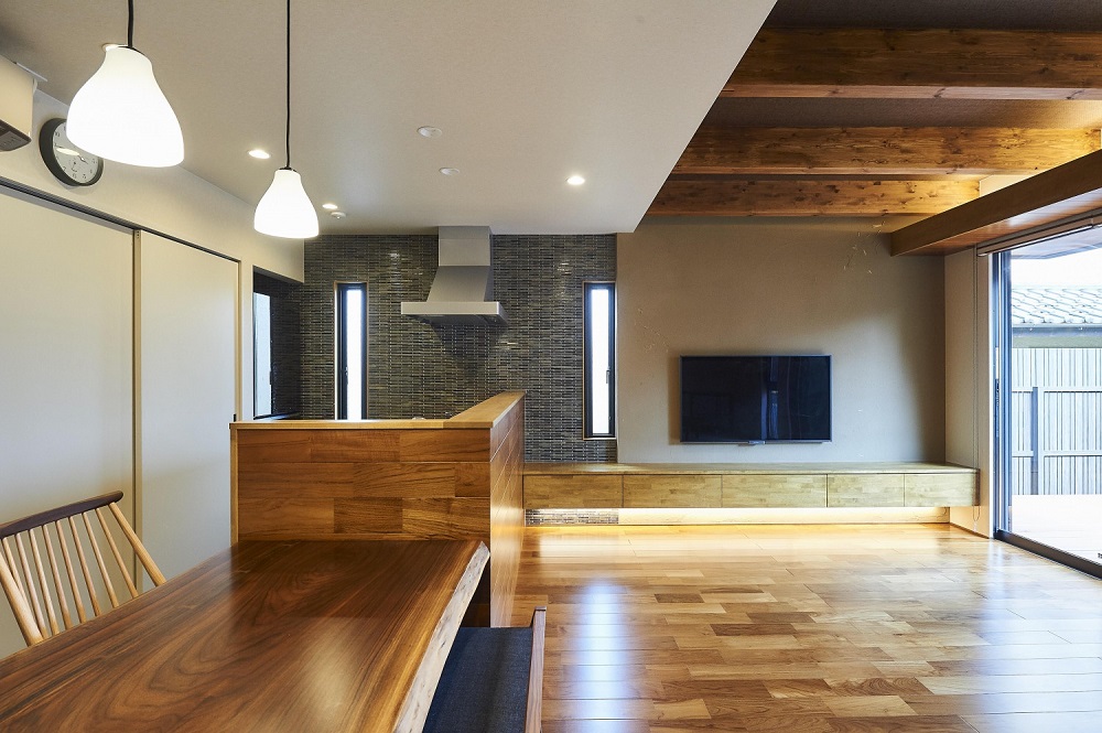 まずは、リビングと対面するキッチンと、広いダイニングテーブルが一体化したデザインです。ダイニングテーブルを広めに設計することで、調理・食事の配膳・後片付けがスムーズになります。家事効率がグンと向上し、掃除・整理整頓も楽になるでしょう。