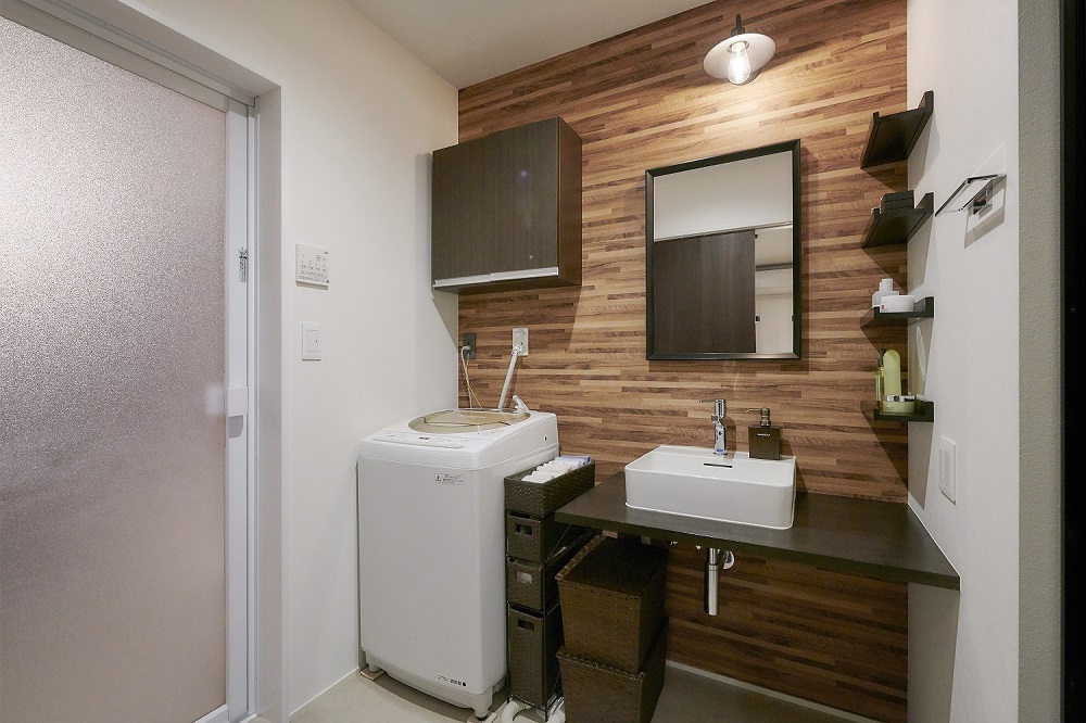 洗面台の上のスペースも広く、メイクをしたり洗濯物を畳んだりする場所としても活用できます。収納ですっきりさせた分、洗面所全体の空間も広くなりバスルームへの移動もスムーズです。