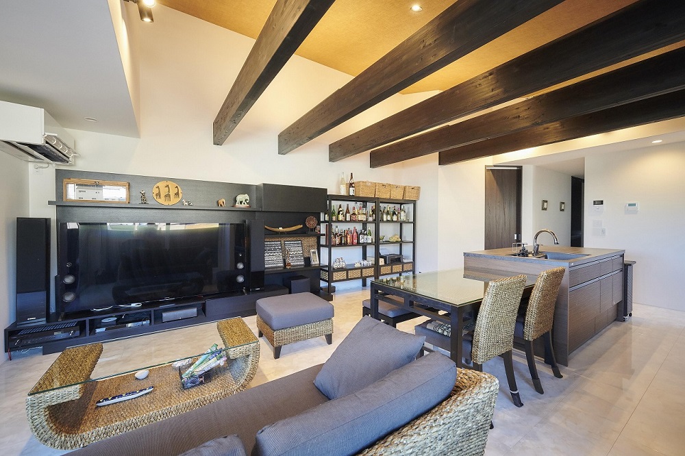 この施工事例の広いLDKのリビングでは、大画面のテレビに大型のボードと棚、さらにこだわりのアジアン家具をそろえた「見せる」収納を実現しています。