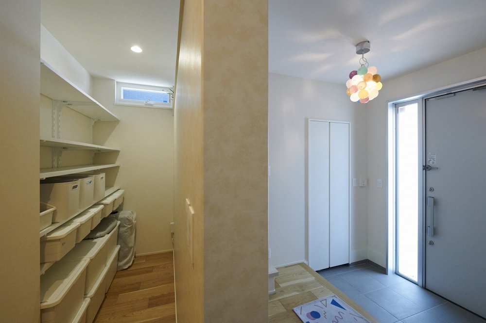 こちらの玄関には、靴などをしまう小さな壁面収納しか置いていませんが、玄関正面の仕切り壁の裏側にマルチ収納を設けています。季節ごとに活用する道具や趣味・部活動の道具、遊び道具など、子どもの成長に合わせてフレキシブルに活用できるスペースです。