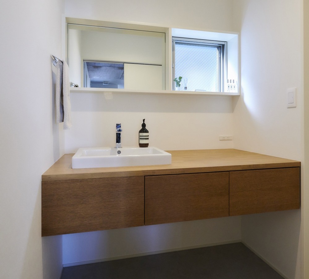 設計段階でどのような物を収納するかをあらかじめ検討し、その量に合わせて高さや長さを設定した洗面台が特徴の施工事例です。細長い洗面台で壁には棚を設置し、洗面台の下にも広い収納スペースを作っています。