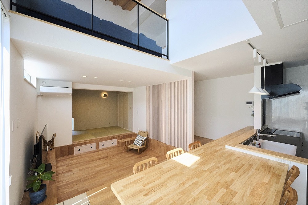 またリビングには、ソファを置く代わりに空間を一段高くして畳を敷きました。寝転がったり物を置いたりと使い勝手が良く、空間を自由に活用したアイデアが光るインテリアです。