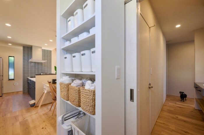 続いての施工事例は、玄関からパントリー、キッチンへと続く動線の良い間取りです。広々とした収納スペースを設けており、調理器具や食器だけでなく調理家電も収納できます。パントリー入り口の両サイドも隙間収納として活用されており、片側にはウォータースタンド用の水栓やダストボックスも配置されています。