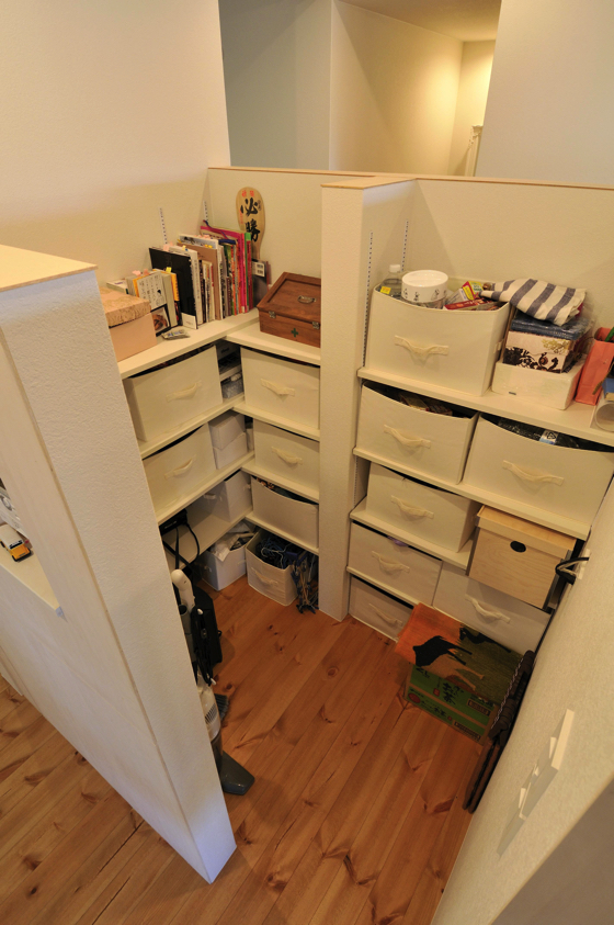 カゴや収納ケースなどを使えばそれぞれ子どもたちの道具を片付けられ、見た目もすっきり。家族の思い出の品などを保管する場所としても活用されています。