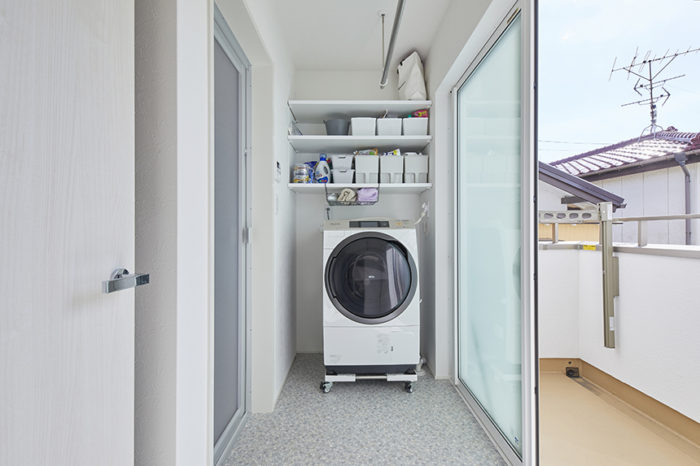 この洗面所のポイントは、すぐにバルコニーに出られる間取りになっていることです。「洗う・干す」の流れがスムーズになる他、同じフロアにクインクローゼットがあるため乾いた洗濯物をすぐにしまえます。