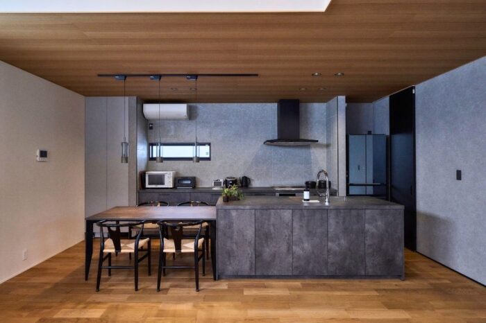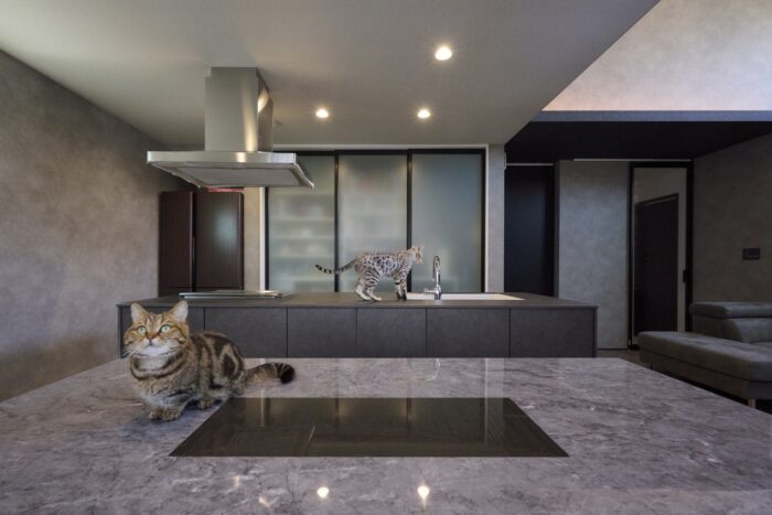 施工事例「ペットと暮らすホテルライクな住まい」はグレーを基調としたシックモダンな雰囲気が漂う空間です。生活の中心を2階に集約することでLDK・水回り・主寝室がスムーズにつながる快適な動線を実現しています。中央で存在感を放つアイランドキッチンからは、家のあちこちでくつろぐペットの様子を眺められるでしょう。