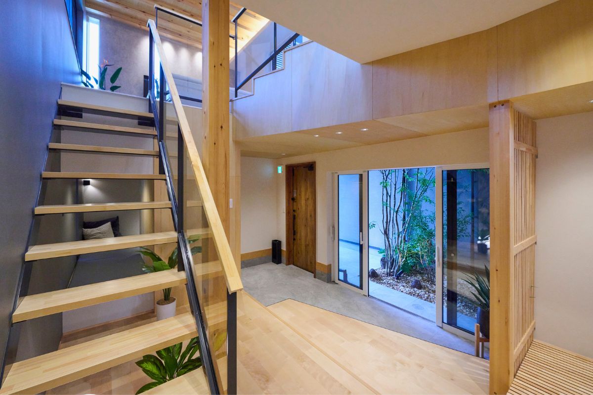 スキップフロアで繋がる3階建て6層の住まい。1階から3階まで吹き抜けた大空間で郊外での開放的な生活を実現しました。