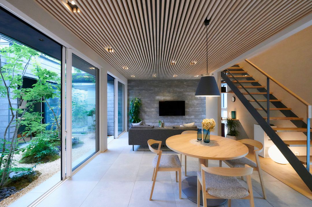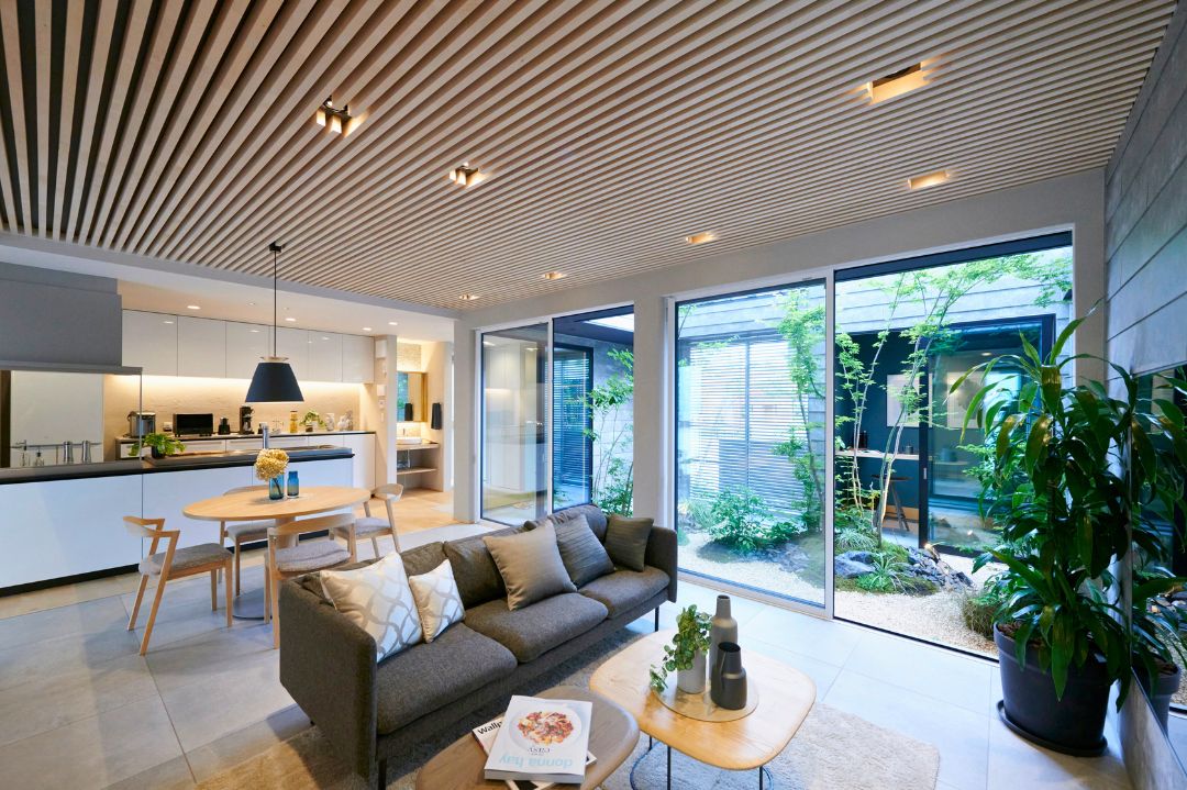 中庭に面して配置された部屋から季節のうつろいや、家族の繋がりが感じられる住まい。