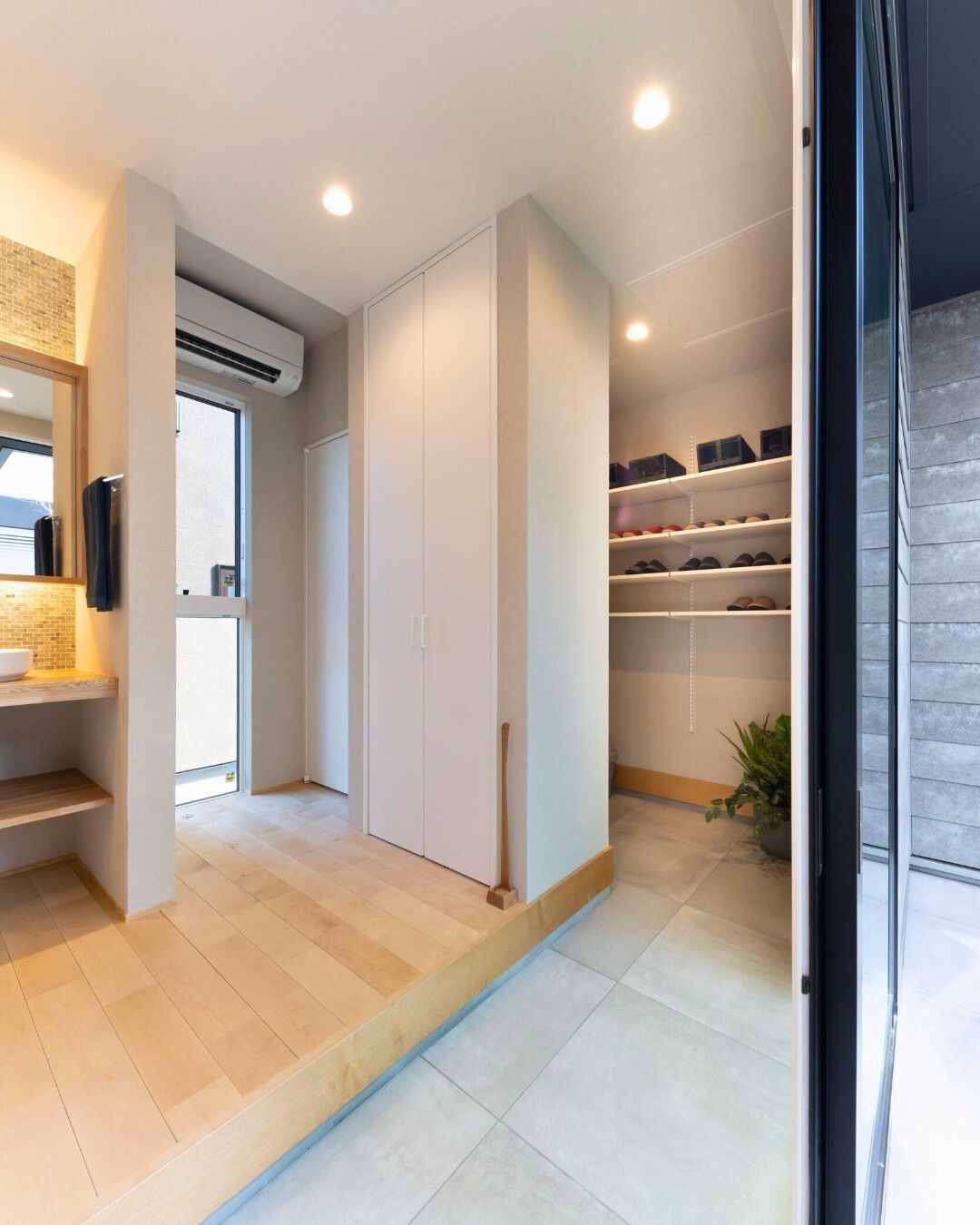 帰宅時の手洗いに重宝する玄関ホール。豊富な収納力が魅力のシューズインクローゼットも設置されています。