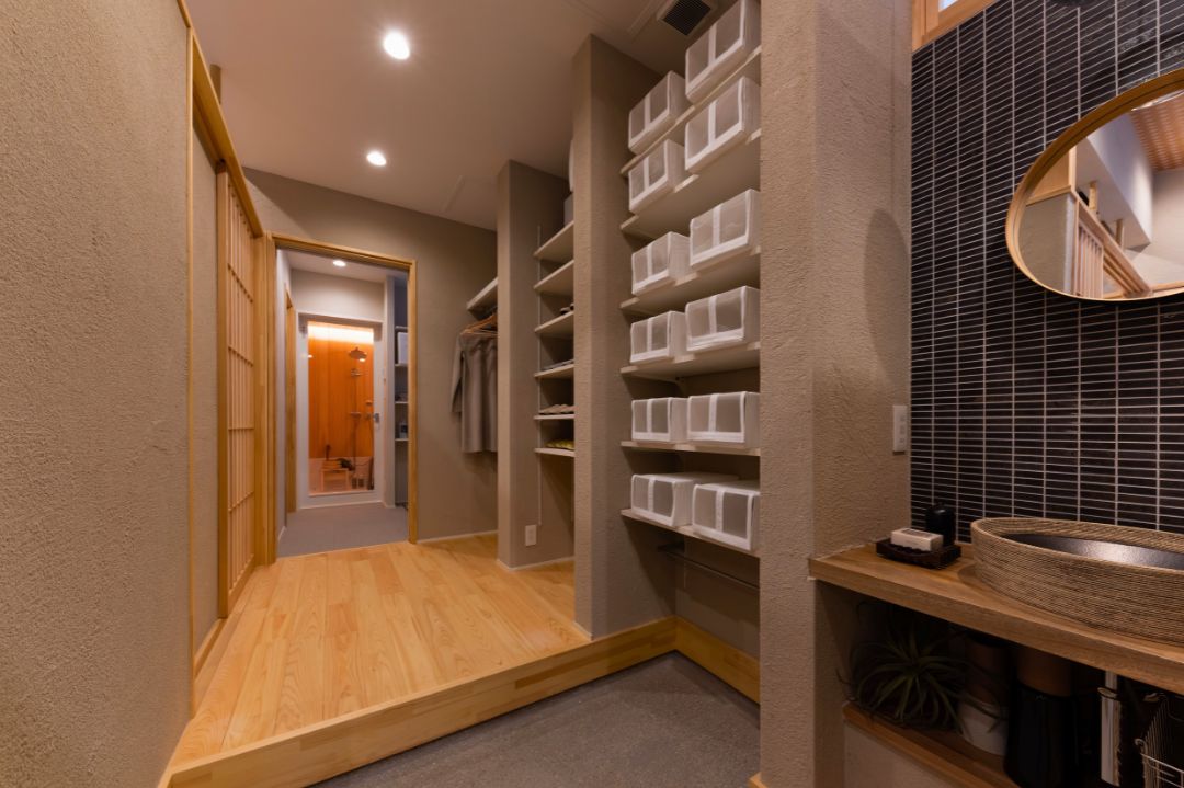 帰宅動線を重視した計画。玄関ホールからサニタリーへと繋がります。さらに、土間収納を含めて、豊富な収納力が魅力の空間です。